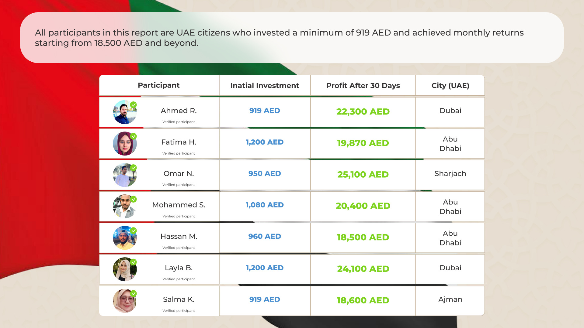 The photo below shows the real names of UAE citizens and their earnings in just 30 days of using the platform.